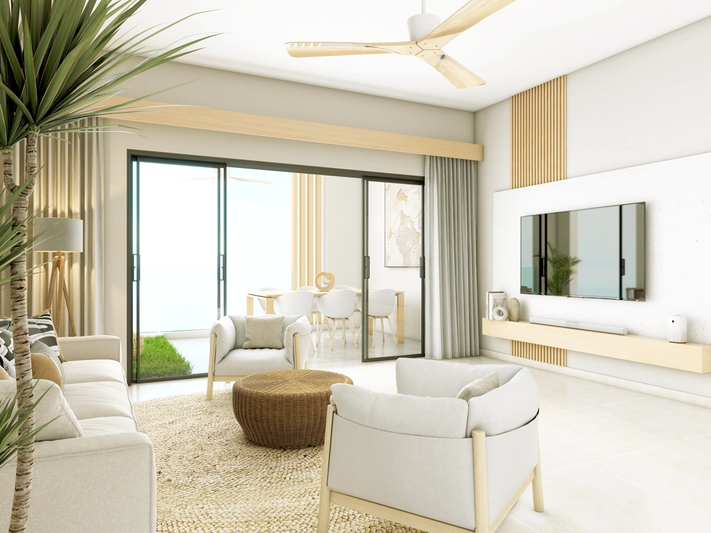Our cosy interiors combine tropical design with elegance and sophistication. The large openings offer abundant natural light, creating a harmonious connection between the interior and exterior. Enjoy a picturesque scenery and the soothing ocean breeze.